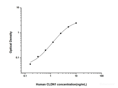 This ELISA kit uses the Sandwich-ELISA principle. The micro ELISA plate provided in this kit has been pre-coated with an antibody specific to Human CLDN1. Standards or samples are added to the micro ELISA plate wells and combined with the specific antibody. Then a biotinylated detection antibody specific for Human CLDN1 and Avidin-Horseradish Peroxidase (HRP) conjugate are added successively to each micro plate well and incubated. Free components are washed away. The substrate solution is added to each well. Only those wells that contain Human CLDN1, biotinylated detection antibody and Avidin-HRP conjugate will appear blue in color. The enzyme-substrate reaction is terminated by the addition of stop solution and the color turns yellow. The optical density (OD) is measured spectrophotometrically at a wavelength of 450 nm ± 2 nm. The OD value is proportional to the concentration of Human CLDN1. You can calculate the concentration of Human CLDN1 in the samples by comparing the OD of the samples to the standard curve.