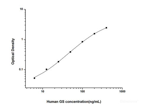This ELISA kit uses the Sandwich-ELISA principle. The micro ELISA plate provided in this kit has been pre-coated with an antibody specific to Human GS. Standards or samples are added to the micro ELISA plate wells and combined with the specific antibody. Then a biotinylated detection antibody specific for Human GS and Avidin-Horseradish Peroxidase (HRP) conjugate are added successively to each micro plate well and incubated. Free components are washed away. The substrate solution is added to each well. Only those wells that contain Human GS, biotinylated detection antibody and Avidin-HRP conjugate will appear blue in color. The enzyme-substrate reaction is terminated by the addition of stop solution and the color turns yellow. The optical density (OD) is measured spectrophotometrically at a wavelength of 450 nm ± 2 nm. The OD value is proportional to the concentration of Human GS. You can calculate the concentration of Human GS in the samples by comparing the OD of the samples to the standard curve.