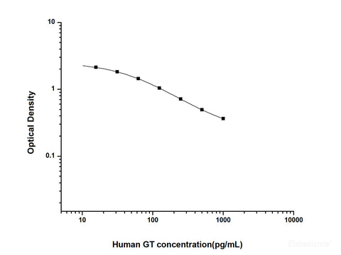 This ELISA kit uses the Competitive-ELISA principle. The micro ELISA plate provided in this kit has been pre-coated with GT. During the reaction, GT in the sample or standard competes with a fixed amount of GT on the solid phase supporter for sites on the Biotinylated Detection Ab specific to GT. Excess conjugate and unbound sample or standard are washed away, and Avidin-Horseradish Peroxidase (HRP) conjugate are added to each micro plate well and incubated. Then a TMB substrate solution is added to each well. The enzyme-substrate reaction is terminated by the addition of stop solution and the color turns from blue to yellow. The optical density (OD) is measured spectrophotometrically at a wavelength of 450 nm ± 2 nm. The concentration of GT in tested samples can be calculated by comparing the OD of the samples to the standard curve.