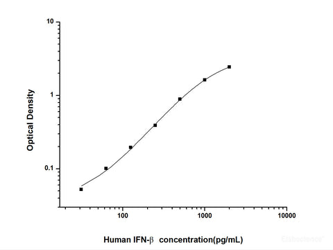 This ELISA kit uses the Sandwich-ELISA principle. The micro ELISA plate provided in this kit has been pre-coated with an antibody specific to Human IFN-β. Standards or samples are added to the micro ELISA plate wells and combined with the specific antibody. Then a biotinylated detection antibody specific for Human IFN-β and Avidin-Horseradish Peroxidase (HRP) conjugate are added successively to each micro plate well and incubated. Free components are washed away. The substrate solution is added to each well. Only those wells that contain Human IFN-β, biotinylated detection antibody and Avidin-HRP conjugate will appear blue in color. The enzyme-substrate reaction is terminated by the addition of stop solution and the color turns yellow. The optical density (OD) is measured spectrophotometrically at a wavelength of 450 nm ± 2 nm. The OD value is proportional to the concentration of Human IFN-β. You can calculate the concentration of Human IFN-β in the samples by comparing the OD of the samples to the standard curve.