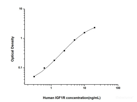 This ELISA kit uses the Sandwich-ELISA principle. The micro ELISA plate provided in this kit has been pre-coated with an antibody specific to Human IGF1R. Standards or samples are added to the micro ELISA plate wells and combined with the specific antibody. Then a biotinylated detection antibody specific for Human IGF1R and Avidin-Horseradish Peroxidase (HRP) conjugate are added successively to each micro plate well and incubated. Free components are washed away. The substrate solution is added to each well. Only those wells that contain Human IGF1R, biotinylated detection antibody and Avidin-HRP conjugate will appear blue in color. The enzyme-substrate reaction is terminated by the addition of stop solution and the color turns yellow. The optical density (OD) is measured spectrophotometrically at a wavelength of 450 nm ± 2 nm. The OD value is proportional to the concentration of Human IGF1R. You can calculate the concentration of Human IGF1R in the samples by comparing the OD of the samples to the standard curve.