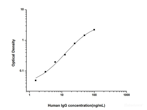 This ELISA kit uses the Sandwich-ELISA principle. The micro ELISA plate provided in this kit has been pre-coated with an antibody specific to Human IgG. Standards or samples are added to the micro ELISA plate wells and combined with the specific antibody. Then a biotinylated detection antibody specific for Human IgG and Avidin-Horseradish Peroxidase (HRP) conjugate are added successively to each micro plate well and incubated. Free components are washed away. The substrate solution is added to each well. Only those wells that contain Human IgG, biotinylated detection antibody and Avidin-HRP conjugate will appear blue in color. The enzyme-substrate reaction is terminated by the addition of stop solution and the color turns yellow. The optical density (OD) is measured spectrophotometrically at a wavelength of 450 nm ± 2 nm. The OD value is proportional to the concentration of Human IgG. You can calculate the concentration of Human IgG in the samples by comparing the OD of the samples to the standard curve.