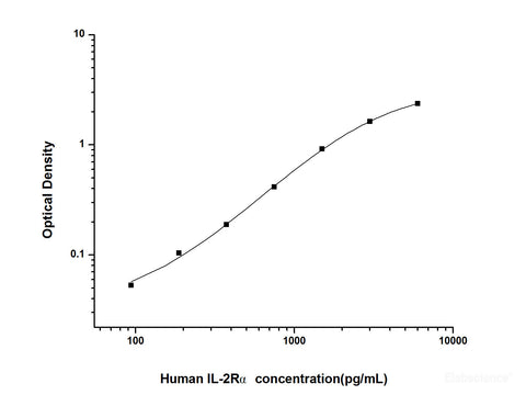 This ELISA kit uses the Sandwich-ELISA principle. The micro ELISA plate provided in this kit has been pre-coated with an antibody specific to Human IL-2Rα. Standards or samples are added to the micro ELISA plate wells and combined with the specific antibody. Then a biotinylated detection antibody specific for Human IL-2Rα and Avidin-Horseradish Peroxidase (HRP) conjugate are added successively to each micro plate well and incubated. Free components are washed away. The substrate solution is added to each well. Only those wells that contain Human IL-2Rα, biotinylated detection antibody and Avidin-HRP conjugate will appear blue in color. The enzyme-substrate reaction is terminated by the addition of stop solution and the color turns yellow. The optical density (OD) is measured spectrophotometrically at a wavelength of 450 nm ± 2 nm. The OD value is proportional to the concentration of Human IL-2Rα. You can calculate the concentration of Human IL-2Rα in the samples by comparing the OD of the samples to the standard curve.