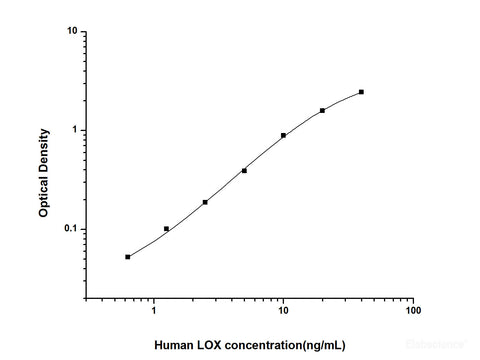 This ELISA kit uses the Sandwich-ELISA principle. The micro ELISA plate provided in this kit has been pre-coated with an antibody specific to Human LOX. Standards or samples are added to the micro ELISA plate wells and combined with the specific antibody. Then a biotinylated detection antibody specific for Human LOX and Avidin-Horseradish Peroxidase (HRP) conjugate are added successively to each micro plate well and incubated. Free components are washed away. The substrate solution is added to each well. Only those wells that contain Human LOX, biotinylated detection antibody and Avidin-HRP conjugate will appear blue in color. The enzyme-substrate reaction is terminated by the addition of stop solution and the color turns yellow. The optical density (OD) is measured spectrophotometrically at a wavelength of 450 nm ± 2 nm. The OD value is proportional to the concentration of Human LOX. You can calculate the concentration of Human LOX in the samples by comparing the OD of the samples to the standard curve.