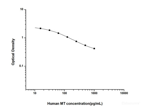This ELISA kit uses the Competitive-ELISA principle. The micro ELISA plate provided in this kit has been pre-coated with MT. During the reaction, MT in the sample or standard competes with a fixed amount of MT on the solid phase supporter for sites on the Biotinylated Detection Ab specific to MT. Excess conjugate and unbound sample or standard are washed away, and Avidin-Horseradish Peroxidase (HRP) conjugate are added to each micro plate well and incubated. Then a TMB substrate solution is added to each well. The enzyme-substrate reaction is terminated by the addition of stop solution and the color turns from blue to yellow. The optical density (OD) is measured spectrophotometrically at a wavelength of 450 nm ± 2 nm. The concentration of MT in tested samples can be calculated by comparing the OD of the samples to the standard curve.
