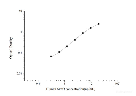 This ELISA kit uses the Sandwich-ELISA principle. The micro ELISA plate provided in this kit has been pre-coated with an antibody specific to Human MYO. Standards or samples are added to the micro ELISA plate wells and combined with the specific antibody. Then a biotinylated detection antibody specific for Human MYO and Avidin-Horseradish Peroxidase (HRP) conjugate are added successively to each micro plate well and incubated. Free components are washed away. The substrate solution is added to each well. Only those wells that contain Human MYO, biotinylated detection antibody and Avidin-HRP conjugate will appear blue in color. The enzyme-substrate reaction is terminated by the addition of stop solution and the color turns yellow. The optical density (OD) is measured spectrophotometrically at a wavelength of 450 nm ± 2 nm. The OD value is proportional to the concentration of Human MYO. You can calculate the concentration of Human MYO in the samples by comparing the OD of the samples to the standard curve.