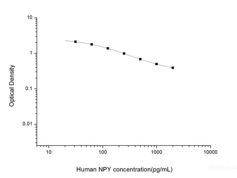 This ELISA kit uses the Competitive-ELISA principle. The micro ELISA plate provided in this kit has been pre-coated with NPY. During the reaction, NPY in the sample or standard competes with a fixed amount of NPY on the solid phase supporter for sites on the Biotinylated Detection Ab specific to NPY. Excess conjugate and unbound sample or standard are washed away, and Avidin-Horseradish Peroxidase (HRP) conjugate are added to each micro plate well and incubated. Then a TMB substrate solution is added to each well. The enzyme-substrate reaction is terminated by the addition of stop solution and the color turns from blue to yellow. The optical density (OD) is measured spectrophotometrically at a wavelength of 450 nm ± 2 nm. The concentration of NPY in tested samples can be calculated by comparing the OD of the samples to the standard curve.