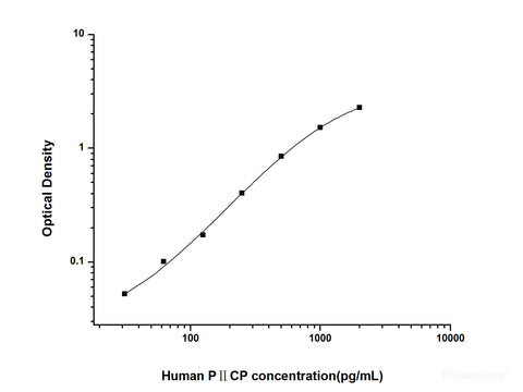 This ELISA kit uses the Sandwich-ELISA principle. The micro ELISA plate provided in this kit has been pre-coated with an antibody specific to Human PⅡCP. Standards or samples are added to the micro ELISA plate wells and combined with the specific antibody. Then a biotinylated detection antibody specific for Human PⅡCP and Avidin-Horseradish Peroxidase (HRP) conjugate are added successively to each micro plate well and incubated. Free components are washed away. The substrate solution is added to each well. Only those wells that contain Human PⅡCP, biotinylated detection antibody and Avidin-HRP conjugate will appear blue in color. The enzyme-substrate reaction is terminated by the addition of stop solution and the color turns yellow. The optical density (OD) is measured spectrophotometrically at a wavelength of 450 nm ± 2 nm. The OD value is proportional to the concentration of Human PⅡCP. You can calculate the concentration of Human PⅡCP in the samples by comparing the OD of the samples to the standard curve.