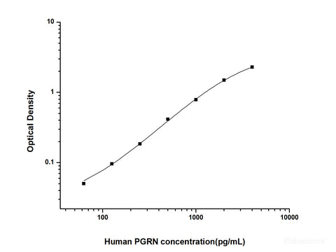 This ELISA kit uses the Sandwich-ELISA principle. The micro ELISA plate provided in this kit has been pre-coated with an antibody specific to Human PGRN. Standards or samples are added to the micro ELISA plate wells and combined with the specific antibody. Then a biotinylated detection antibody specific for Human PGRN and Avidin-Horseradish Peroxidase (HRP) conjugate are added successively to each micro plate well and incubated. Free components are washed away. The substrate solution is added to each well. Only those wells that contain Human PGRN, biotinylated detection antibody and Avidin-HRP conjugate will appear blue in color. The enzyme-substrate reaction is terminated by the addition of stop solution and the color turns yellow. The optical density (OD) is measured spectrophotometrically at a wavelength of 450 nm ± 2 nm. The OD value is proportional to the concentration of Human PGRN. You can calculate the concentration of Human PGRN in the samples by comparing the OD of the samples to the standard curve.