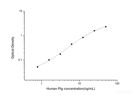 This ELISA kit uses the Sandwich-ELISA principle. The micro ELISA plate provided in this kit has been pre-coated with an antibody specific to Human Plg. Standards or samples are added to the micro ELISA plate wells and combined with the specific antibody. Then a biotinylated detection antibody specific for Human Plg and Avidin-Horseradish Peroxidase (HRP) conjugate are added successively to each micro plate well and incubated. Free components are washed away. The substrate solution is added to each well. Only those wells that contain Human Plg, biotinylated detection antibody and Avidin-HRP conjugate will appear blue in color. The enzyme-substrate reaction is terminated by the addition of stop solution and the color turns yellow. The optical density (OD) is measured spectrophotometrically at a wavelength of 450 nm ± 2 nm. The OD value is proportional to the concentration of Human Plg. You can calculate the concentration of Human Plg in the samples by comparing the OD of the samples to the standard curve.