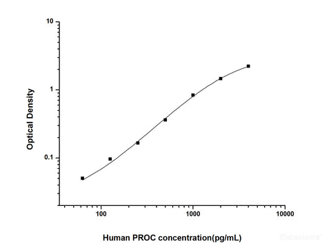 This ELISA kit uses the Sandwich-ELISA principle. The micro ELISA plate provided in this kit has been pre-coated with an antibody specific to Human PROC. Standards or samples are added to the micro ELISA plate wells and combined with the specific antibody. Then a biotinylated detection antibody specific for Human PROC and Avidin-Horseradish Peroxidase (HRP) conjugate are added successively to each micro plate well and incubated. Free components are washed away. The substrate solution is added to each well. Only those wells that contain Human PROC, biotinylated detection antibody and Avidin-HRP conjugate will appear blue in color. The enzyme-substrate reaction is terminated by the addition of stop solution and the color turns yellow. The optical density (OD) is measured spectrophotometrically at a wavelength of 450 nm ± 2 nm. The OD value is proportional to the concentration of Human PROC. You can calculate the concentration of Human PROC in the samples by comparing the OD of the samples to the standard curve.