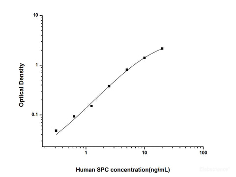 This ELISA kit uses the Sandwich-ELISA principle. The micro ELISA plate provided in this kit has been pre-coated with an antibody specific to Human SPC. Standards or samples are added to the micro ELISA plate wells and combined with the specific antibody. Then a biotinylated detection antibody specific for Human SPC and Avidin-Horseradish Peroxidase (HRP) conjugate are added successively to each micro plate well and incubated. Free components are washed away. The substrate solution is added to each well. Only those wells that contain Human SPC, biotinylated detection antibody and Avidin-HRP conjugate will appear blue in color. The enzyme-substrate reaction is terminated by the addition of stop solution and the color turns yellow. The optical density (OD) is measured spectrophotometrically at a wavelength of 450 nm ± 2 nm. The OD value is proportional to the concentration of Human SPC. You can calculate the concentration of Human SPC in the samples by comparing the OD of the samples to the standard curve.