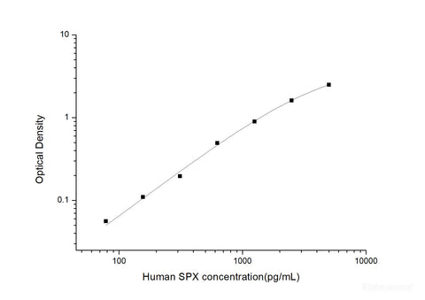This ELISA kit uses the Sandwich-ELISA principle. The micro ELISA plate provided in this kit has been pre-coated with an antibody specific to Human SPX. Standards or samples are added to the micro ELISA plate wells and combined with the specific antibody. Then a biotinylated detection antibody specific for Human SPX and Avidin-Horseradish Peroxidase (HRP) conjugate are added successively to each micro plate well and incubated. Free components are washed away. The substrate solution is added to each well. Only those wells that contain Human SPX, biotinylated detection antibody and Avidin-HRP conjugate will appear blue in color. The enzyme-substrate reaction is terminated by the addition of stop solution and the color turns yellow. The optical density (OD) is measured spectrophotometrically at a wavelength of 450 nm ± 2 nm. The OD value is proportional to the concentration of Human SPX. You can calculate the concentration of Human SPX in the samples by comparing the OD of the samples to the standard curve.