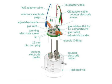 The cell elements are constructed with materials that are inert to the sample (glass and PEEK). It well fits aqueous (FKM/EPDM O-Rings) and organic solvent (FFKM O-Rings) electrolyte requirements. The construction is gas-tight and can be used when the removal and exclusion of contaminants such as oxygen and water is required by bubbling of an inert gas through the electrolyte.