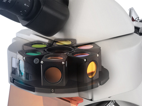 - As standard, the filter wheel which has up to 6 fittings is fitted with a B/G/UV/V fluorescence filter