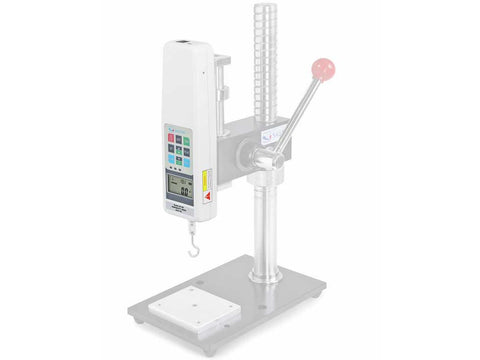 Universal digital force gauge for tensile and compressive force measurements with integrated load cell.