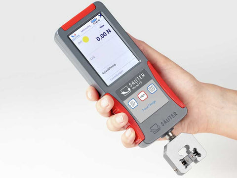 The SAUTER FS premium force gauge has an load measuring cell for tensile and compressive force applications. Either mobile for rapid testing or stationary integrated into a test stand or production line, the multifunction display allows all the values recorded to be read off at a glance in real time. Via the integrated interface, the data can be sent to a PC or laptop for further processing. - Use with external load cells
