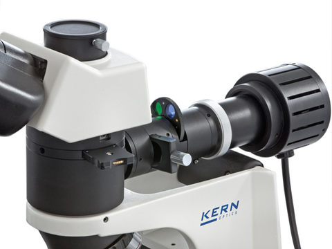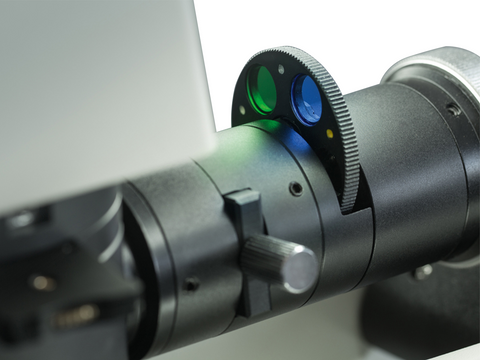 - The illumination unit with an integrated 5-slot filter wheel for blue, green, yellow, grey and blank means that you can quickly change the colour filter for different contrast views.