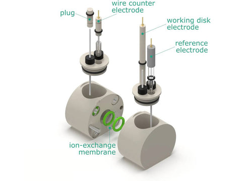 This cell allows several approaches to perform measurements in 2- or 3-electrode setups. It is designed to investigate the performance of a material (e.g. nanocrystalline material or conducting polymer) deposited on a working disk electrode, material drop-casted on a metal mesh or a metal foil current collector, or electrochemically active objects installed in a Tantalum clip. The metal wire counter electrode is mounted in the second chamber, while the reference electrode is mounted in a lid of the same chamber as the working electrode. Various counter electrodes are suitable for this cell including metal wire, gauze and foil electrodes as well as non-metal electrodes such as graphite rod. Typical applications include: basic electrochemistry, long-term measurements, RE potential measurements as well as electrosynthesis.