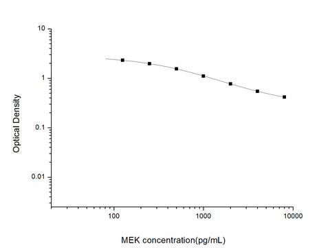 This ELISA kit uses the Competitive-ELISA principle. The micro ELISA plate provided in this kit has been pre-coated with Universal MEK. During the reaction, Universal MEK in the sample or standard competes with a fixed amount of Universal MEK on the solid phase supporter for sites on the Biotinylated Detection Ab specific to Universal MEK. Excess conjugate and unbound sample or standard are washed away, and Avidin-Horseradish Peroxidase (HRP) conjugate are added to each micro plate well and incubated. Then a TMB substrate solution is added to each well. The enzyme-substrate reaction is terminated by the addition of stop solution and the color turns from blue to yellow. The optical density (OD) is measured spectrophotometrically at a wavelength of 450 nm ± 2 nm. The concentration of Universal MEK in tested samples can be calculated by comparing the OD of the samples to the standard curve.