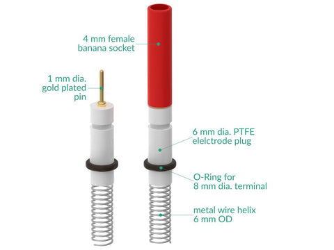 This electrode is typically used with low volume (1-2 mL) electrochemical cells (e.g. spectro-electrochemical cells, or photo-electrochemical flow cells), where space limitations do not allow using PTFE 50HX15 0.6/250 mm model. The metal wire electrode is immersed in the ion-conducting solution as a counter electrode. An electric current is passed between the working electrode and the counter electrode for a certain amount of time. After the process, the electrode should be washed several times with isopropanol or ethanol and dried under the nitrogen flow. Store the metal wire electrode in the glass vial sealed with O-rings (all included in the package).
