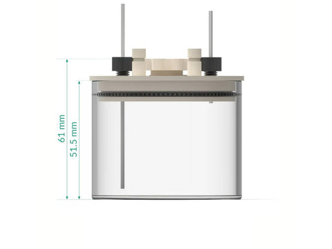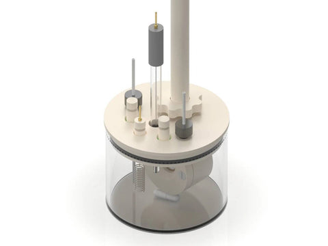This is a stationary solution voltammetry cell for simultaneous measurements of electrochemical response and Quartz Crystal Microbalance sensing. This EQCM cell has been developed specifically for QSH-Dip sensor holder supplied by MicroVacuum. This holder exposes the sensing side of the QCM sensor and is otherwise sealed, so that it can be immersed into a cell full of liquid. In this configuration, a thin film of measured material is deposited directly on sensing side of the QCM sensor. The EQCM cell is compatible with QCM-I Mini (QCM-D) and QCM-I (QCM-D) systems with impedance measurement and dissipation monitoring. The QSH-Dip sensor holder (not included in the cell) is mounted in a top casing together with counter or/and reference electrodes (also not included). Such electrode assembly allows measurements in either 2-, or 3-electrode setup. There are two additional 6 mm dia. electrode ports in the lid, plugged if not used. The cell elements are constructed with materials that are inert to the sample (glass and PEEK). It well fits aqueous (FKM O-Rings) and organic solvent (FFKM O-Rings) electrolyte requirements. The construction is gas-tight and can be used when the removal and exclusion of contaminants such as oxygen and water is required by bubbling of an inert gas through the electrolyte.