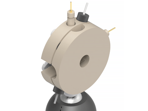 This is a horizontally mounted, multi-purpose spectroelectrochemical cell with 4 mm long optical path (i.e. electrolyte thickness) designed to be used with standard UV-Vis or IR spectrometers. It enables obtaining electrochemical and spectroscopic information from liquid sample or thin film in systems where variations in applied potential induce changes in observed spectra. It consists of a polyether ether ketone (PEEK) flow chamber equipped with magnetic mount sample holder (a screw version is available on request), screw mount quartz window holder and two different mini tripods. It well fits aqueous (EPDM O-Rings) and organic solvent (FFKM O-Rings) electrolyte requirements. Unlike Spectro-EFC 1.75 mL, this cell is meant to be used with pseudo-reference electrode (50 mm long) and counter electrode in the form of a metal wire (90 mm long), both with plug of 6 mm in diameter. Thanks to the application of pseudo-reference electrode, the thickness of an electrolyte is reduced from 12 mm down to 4 mm.