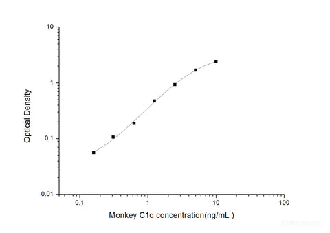 This ELISA kit uses the Sandwich-ELISA principle. The micro ELISA plate provided in this kit has been pre-coated with an antibody specific to Monkey C1q. Standards or samples are added to the micro ELISA plate wells and combined with the specific antibody. Then a biotinylated detection antibody specific for Monkey C1q and Avidin-Horseradish Peroxidase (HRP) conjugate are added successively to each micro plate well and incubated. Free components are washed away. The substrate solution is added to each well. Only those wells that contain Monkey C1q, biotinylated detection antibody and Avidin-HRP conjugate will appear blue in color. The enzyme-substrate reaction is terminated by the addition of stop solution and the color turns yellow. The optical density (OD) is measured spectrophotometrically at a wavelength of 450 nm ± 2 nm. The OD value is proportional to the concentration of Monkey C1q. You can calculate the concentration of Monkey C1q in the samples by comparing the OD of the samples to the standard curve.