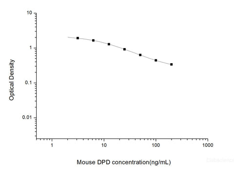 This ELISA kit uses the Competitive-ELISA principle. The micro ELISA plate provided in this kit has been pre-coated with DPD. During the reaction, DPD in the sample or standard competes with a fixed amount of DPD on the solid phase supporter for sites on the Biotinylated Detection Ab specific to DPD. Excess conjugate and unbound sample or standard are washed away, and Avidin-Horseradish Peroxidase (HRP) conjugate are added to each micro plate well and incubated. Then a TMB substrate solution is added to each well. The enzyme-substrate reaction is terminated by the addition of stop solution and the color turns from blue to yellow. The optical density (OD) is measured spectrophotometrically at a wavelength of 450 nm ± 2 nm. The concentration of DPD in tested samples can be calculated by comparing the OD of the samples to the standard curve.