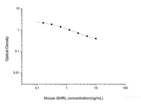 This ELISA kit uses the Competitive-ELISA principle. The micro ELISA plate provided in this kit has been pre-coated with GHRL. During the reaction, GHRL in the sample or standard competes with a fixed amount of GHRL on the solid phase supporter for sites on the Biotinylated Detection Ab specific to GHRL. Excess conjugate and unbound sample or standard are washed away, and Avidin-Horseradish Peroxidase (HRP) conjugate are added to each micro plate well and incubated. Then a TMB substrate solution is added to each well. The enzyme-substrate reaction is terminated by the addition of stop solution and the color turns from blue to yellow. The optical density (OD) is measured spectrophotometrically at a wavelength of 450 nm ± 2 nm. The concentration of GHRL in tested samples can be calculated by comparing the OD of the samples to the standard curve.