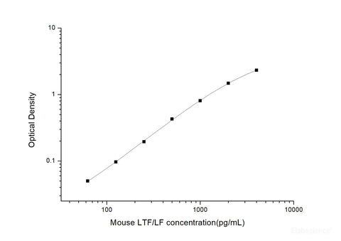 This ELISA kit uses the Sandwich-ELISA principle. The micro ELISA plate provided in this kit has been pre-coated with an antibody specific to Mouse LTF/LF. Standards or samples are added to the micro ELISA plate wells and combined with the specific antibody. Then a biotinylated detection antibody specific for Mouse LTF/LF and Avidin-Horseradish Peroxidase (HRP) conjugate are added successively to each micro plate well and incubated. Free components are washed away. The substrate solution is added to each well. Only those wells that contain Mouse LTF/LF, biotinylated detection antibody and Avidin-HRP conjugate will appear blue in color. The enzyme-substrate reaction is terminated by the addition of stop solution and the color turns yellow. The optical density (OD) is measured spectrophotometrically at a wavelength of 450 nm ± 2 nm. The OD value is proportional to the concentration of Mouse LTF/LF. You can calculate the concentration of Mouse LTF/LF in the samples by comparing the OD of the samples to the standard curve.