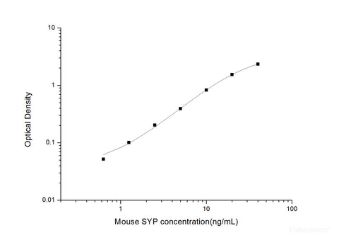 This ELISA kit uses the Sandwich-ELISA principle. The micro ELISA plate provided in this kit has been pre-coated with an antibody specific to Mouse SYP. Standards or samples are added to the micro ELISA plate wells and combined with the specific antibody. Then a biotinylated detection antibody specific for Mouse SYP and Avidin-Horseradish Peroxidase (HRP) conjugate are added successively to each micro plate well and incubated. Free components are washed away. The substrate solution is added to each well. Only those wells that contain Mouse SYP, biotinylated detection antibody and Avidin-HRP conjugate will appear blue in color. The enzyme-substrate reaction is terminated by the addition of stop solution and the color turns yellow. The optical density (OD) is measured spectrophotometrically at a wavelength of 450 nm ± 2 nm. The OD value is proportional to the concentration of Mouse SYP. You can calculate the concentration of Mouse SYP in the samples by comparing the OD of the samples to the standard curve.