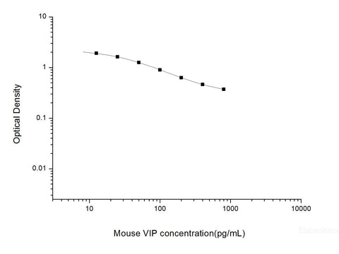 This ELISA kit uses the Competitive-ELISA principle. The micro ELISA plate provided in this kit has been pre-coated with VIP. During the reaction, VIP in the sample or standard competes with a fixed amount of VIP on the solid phase supporter for sites on the Biotinylated Detection Ab specific to VIP. Excess conjugate and unbound sample or standard are washed away, and Avidin-Horseradish Peroxidase (HRP) conjugate are added to each micro plate well and incubated. Then a TMB substrate solution is added to each well. The enzyme-substrate reaction is terminated by the addition of stop solution and the color turns from blue to yellow. The optical density (OD) is measured spectrophotometrically at a wavelength of 450 nm ± 2 nm. The concentration of VIP in tested samples can be calculated by comparing the OD of the samples to the standard curve.