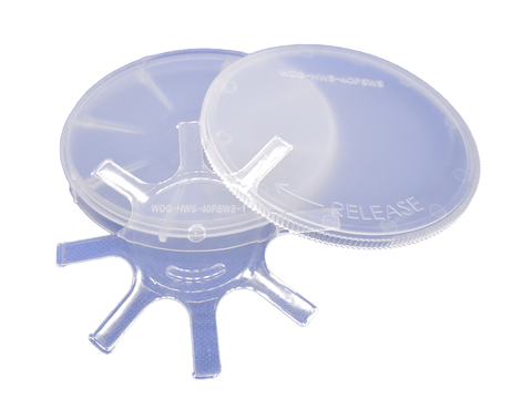 Each Single Wafer Carrier Case includes a spider ring (pressure retention), lid and the base case. The wafer carriers have a conical base to support the wafers at the edges only. The wafers are held in place and secured by a spider spring and locking lid.
