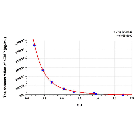 | Test principle | This assay employs the competitive inhibition enzyme immunoassay technique. The microtiter plate provided in this kit has been pre-coated with cGMP. Standards or samples are added to the appropriate microtiter plate wells then with a biotin-conjugated antibody specific to cGMP. Next, Avidin conjugated to Horseradish Peroxidase (HRP) is added to each microplate well and incubated. After TMB substrate solution is added. The enzyme-substrate reaction is terminated by the addition of sulphuric acid solution and the color change is measured spectrophotometrically at a wavelength of 450nm ± 10nm. The concentration of cGMP in the samples is then determined by comparing the OD of the samples to the standard curve. |