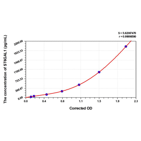 Test principle The test principle applied in this kit is Sandwich enzyme immunoassay. The microtiter plate provided in this kit has been pre-coated with an antibody specific to Human ST6GAL1. Standards or samples are added to the appropriate microtiter plate wells then with a biotin-conjugated antibody specific to Human ST6GAL1. Next, Avidin conjugated to Horseradish Peroxidase (HRP) is added to each microplate well and incubated. After TMB substrate solution is added, only those wells that contain Human ST6GAL1, biotin-conjugated antibody and enzyme-conjugated Avidin will exhibit a change in color. The enzyme-substrate reaction is terminated by the addition of sulphuric acid solution and the color change is measured spectrophotometrically at a wavelength of 450nm ± 10nm. The concentration of Human ST6GAL1 in the samples is then determined by comparing the OD of the samples to the standard curve.