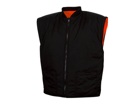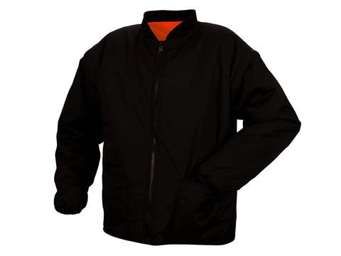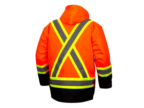 Hi-vis polyester shell with quilted lining and storm cuffs.