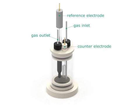 The reference electrode tip should be placed close to the QCM sensor surface (3-5 mm), where the working electrode is exposed to the electrolyte. This will ensure a negligible potential drop throughout the electrolyte solution for low-current experiment. Various auxiliary electrodes are suitable for this cell including metal wire and metal foil electrodes as well as graphite rod. The bubbling of gas through the solution must be stopped prior to experiment.