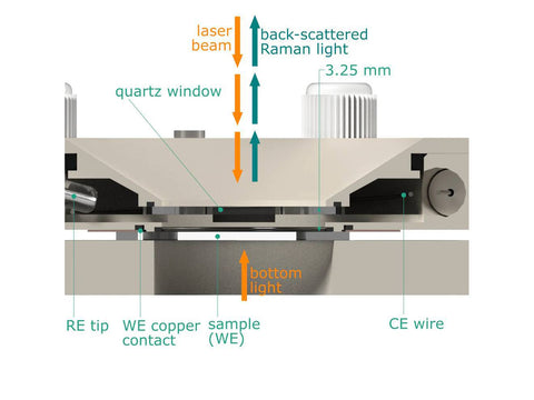 This cell combines two classical analytical techniques such as electrochemistry and Raman spectroscopy, to obtain in-situ chemical information about the reactions taking place during an electrochemical experiment. It consists mainly of three elements: (i) sample holder with Tantalum (formerly Copper) foil serving as an electric contact to working electrode surface, (ii) chamber in which reference and counter electrodes are installed together with electrolyte inlet and outlet and (iii) lid which seals the cell and holds the Sapphire window. The sample consisting of a thin film of electrochemically active material deposited on a rigid or flexible substrate (working electrode) is loaded from the bottom via magnetic or screw mount. The counter or/and reference electrodes are mounted in a top casing (either 2-, or 3-electrode setup. The oval counter electrode made of e.g. Platinum wire assures uniform distribution of the field lines along the path to working electrode. During an experiment Raman laser is focused onto the surface of a thin film working electrode through a transparent Sapphire window and thin layer of electrolyte (total optical path of 3.25 mm). The electrolyte thickness of 2.25 mm ensures free diffusion of ions (e.g. protons) and its counter ions.