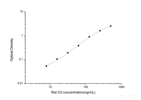 This ELISA kit uses the Sandwich-ELISA principle. The micro ELISA plate provided in this kit has been pre-coated with an antibody specific to Rat C3. Standards or samples are added to the micro ELISA plate wells and combined with the specific antibody. Then a biotinylated detection antibody specific for Rat C3 and Avidin-Horseradish Peroxidase (HRP) conjugate are added successively to each micro plate well and incubated. Free components are washed away. The substrate solution is added to each well. Only those wells that contain Rat C3, biotinylated detection antibody and Avidin-HRP conjugate will appear blue in color. The enzyme-substrate reaction is terminated by the addition of stop solution and the color turns yellow. The optical density (OD) is measured spectrophotometrically at a wavelength of 450 nm ± 2 nm. The OD value is proportional to the concentration of Rat C3. You can calculate the concentration of Rat C3 in the samples by comparing the OD of the samples to the standard curve.