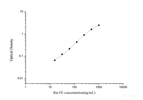 This ELISA kit uses the Sandwich-ELISA principle. The micro ELISA plate provided in this kit has been pre-coated with an antibody specific to Rat FE. Standards or samples are added to the micro ELISA plate wells and combined with the specific antibody. Then a biotinylated detection antibody specific for Rat FE and Avidin-Horseradish Peroxidase (HRP) conjugate are added successively to each micro plate well and incubated. Free components are washed away. The substrate solution is added to each well. Only those wells that contain Rat FE, biotinylated detection antibody and Avidin-HRP conjugate will appear blue in color. The enzyme-substrate reaction is terminated by the addition of stop solution and the color turns yellow. The optical density (OD) is measured spectrophotometrically at a wavelength of 450 nm ± 2 nm. The OD value is proportional to the concentration of Rat FE. You can calculate the concentration of Rat FE in the samples by comparing the OD of the samples to the standard curve.