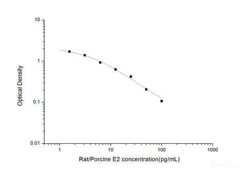 This ELISA kit uses the Competitive-ELISA principle. The micro ELISA plate provided in this kit has been pre-coated with E2. During the reaction, E2 in the sample or standard competes with a fixed amount of E2 on the solid phase supporter for sites on the Biotinylated Detection Ab specific to E2. Excess conjugate and unbound sample or standard are washed away, and Avidin-Horseradish Peroxidase (HRP) conjugate are added to each micro plate well and incubated. Then a TMB substrate solution is added to each well. The enzyme-substrate reaction is terminated by the addition of stop solution and the color turns from blue to yellow. The optical density (OD) is measured spectrophotometrically at a wavelength of 450 nm ± 2 nm. The concentration of E2 in tested samples can be calculated by comparing the OD of the samples to the standard curve.