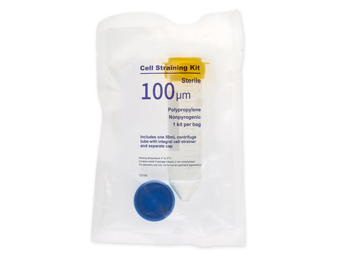 Each sterile kit contains a SureStrain™ Strainer, pre-attached to a 50mL tube, with a separate screw-cap ready for assembly, processing and storage after the filtration is complete. Kits are supplied in easy open “tear-strip” bags and gamma sterilized.