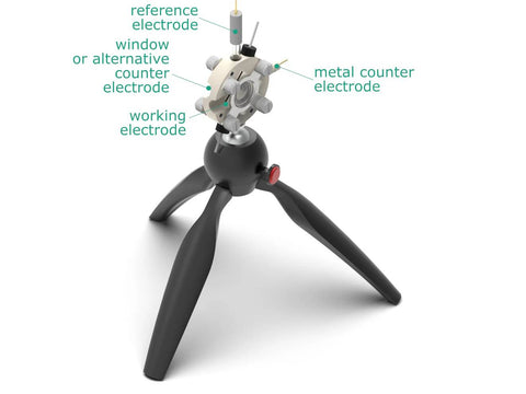 This is a horizontally mounted, multi-purpose spectroelectrochemical cell designed to be used with standard UV-Vis or IR spectrometers. It enables obtaining electrochemical and spectroscopic information from liquid sample or thin films in systems where variations in applied potential induce changes in observed spectra. It is perfect a solution for a fast prototyping of electrochromic windows and displays where both, working and counter thin film electrodes can be characterized. It consists of a polyether ether ketone (PEEK) flow chamber equipped with two screw mount sample/window holders and two different mini tripods. It well fits aqueous (FKM O-Rings) and organic solvent (FFKM O-Rings) electrolyte requirements. The cell is meant to be used with standard reference electrode having 6 mm in diameter and counter electrode either in the form of a rod or helix with 6 mm in diameter and 15 mm active length.