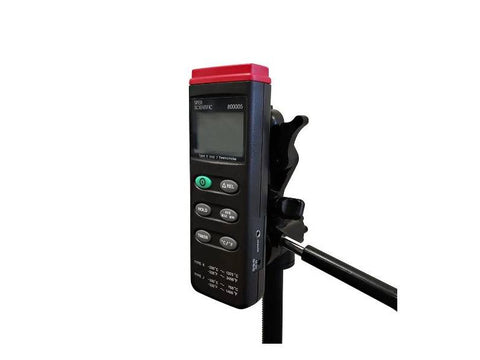 This unique portable thermometer displays data from 4 thermocouple probes simultaneously on a large back-lit LCD. Communicates with a computer via the bi-directional computer port and optional cable, and graphic software. Auto ranging with auto power off, min/max, hold, Δ (T1-T2) and relative functions. High full scale accuracy of ±0.5% rdg. + 1ºC / 2ºF. Easily calibrates to ice point, or any other standard. 0.1° resolution <200° & 1° >200°C. Wide measurement range of -328 to 2498°F (-200 to 1370°C). Comes ready to use with 2 beaded wire probes, instructions, and a 9V battery, in a protective, foam-lined case. Can also be used with optional AC Adapter (800003). N.I.S.T. traceable Certificate of Calibration available.