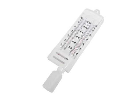 One thermometer bulb is kept constantly wet by a siphon reservoir while the other gives a dry temperature reading. Humidity is obtained by comparing the two readings on the enclosed chart. The red liquid masons hygrometer uses a safe and easy to read red liquid in place of the usual mercury. Dual scales of -10/50°C and 10/120°F.