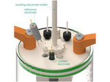 This is a stationary solution standard electrochemical (electrolytic) cell for measurements of electrodes in a form of: a) rod/disc (6 mm dia.), b) thin film deposited on flat substrate (using a sample holder) and c) free-standing membrane (using the basic sample holder). The working, counter and reference electrodes (not included in the setup) are mounted in a top casing either in 2-, or 3-electrode setup. The cell has two spare ports for connection of e.g. thermometer, Clark electrode, pH meter electrode, or other 6 mm dia. electrode/probe.