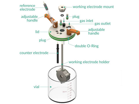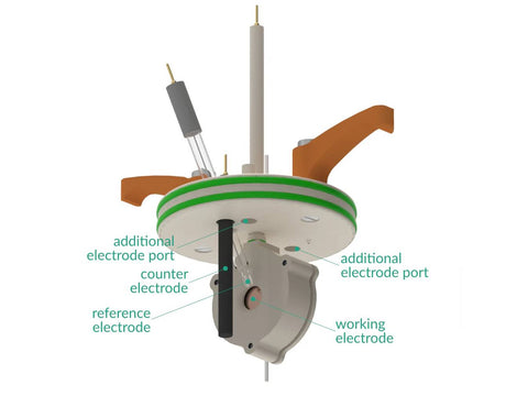 The cell elements are constructed with materials that are inert to the sample (glass and PEEK). It well fits aqueous (FKM/EPDM O-Rings) and organic solvent (FFKM O-Rings) electrolyte requirements. The construction is gas-tight and can be used when the removal and exclusion of contaminants such as oxygen and water is required by bubbling of an inert gas through the electrolyte.