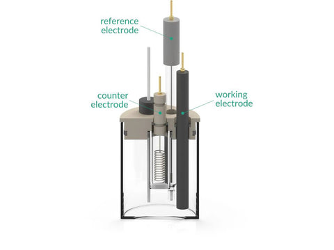 The reference electrode tip should be placed at the level of working electrode center. This will ensure a low potential drop throughout the electrolyte solution for low-current experiment. Various auxiliary electrodes are suitable for this cell including metal wire and metal foil electrodes as well as graphite rod. The bubbling of gas through the solution must be stopped prior to experiment.