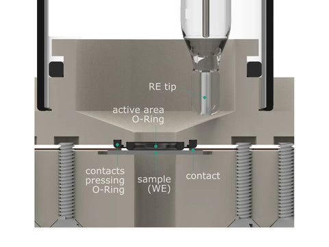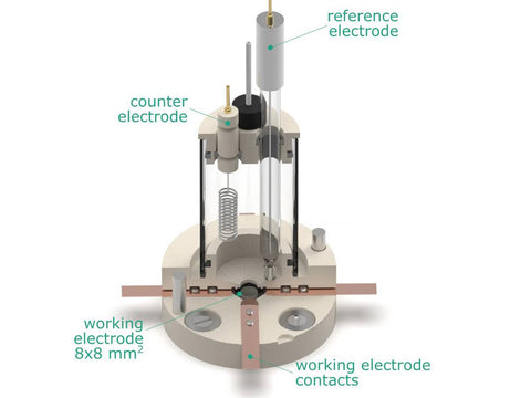 This is a stationary solution voltammetry cell designed to measure changes in specific resistivity of thin film material induced by the injection/extraction of ions from/to an electrolyte. The process is controlled through the application of voltage to the counter electrode immersed in liquid or gel electrolyte. The sample is loaded from the bottom via magnetic or screw mount, while counter or/and reference electrodes are mounted in a top casing (either 2-, or 3-electrode setup). The cell elements are constructed with materials that are inert to the sample (glass and PEEK). It well fits aqueous (EPDM/FKM O-Rings) and organic solvent (FFKM O-Rings) electrolyte requirements. The construction is gas-tight and can be used when the removal and exclusion of contaminants such as oxygen and water is required by bubbling of an inert gas through the electrolyte.